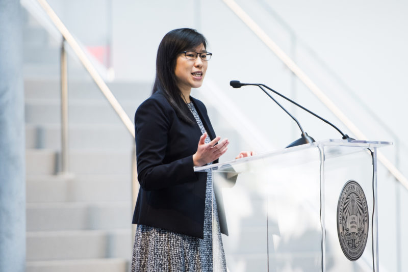 Following Bean in delivering remarks was Jaclyn Lock, a doctoral student in bioengineering. She said she was drawn to Northeastern for its strong training and research programs, and she emphasized the value of the opportunities she’s had to build upon her interdisciplinary research. Her research, under professor Rebecca Carrier, focuses on the link between the food we eat and our mucus production.