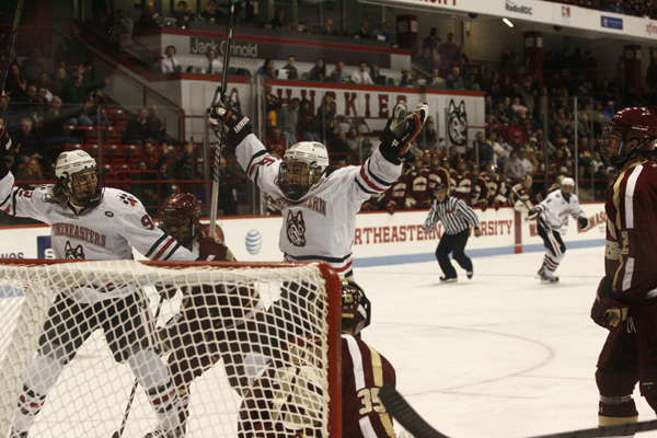 The Northeastern University men’s hockey team defeated the No. 1 Boston College Eagles 3-1 on Saturday night before a raucous sold-out crowd of 4,746 at Matthews Arena.