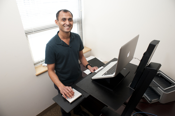 That’s the thinking behind the increasing popularity of standing desks, the focus of research by Dinesh John, an assistant professor of health sciences. This semester, John is leading a pilot study focused on observing and monitoring a group of Northeastern staff members equipped with new workstations that allow them to complete their day-to-day tasks on their feet.
