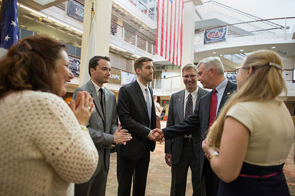 At the symposium’s opening ceremony, Erik DeGiorgi described the difficulty of adjusting to civilian life after combat duty in Afghanistan. DeGiorgi, a Marine Corps veteran and the advisory board’s chairman, noted that college has inspired him to succeed, saying, “It wasn’t until I stepped into a classroom that I discovered who I was and what I was capable of.”