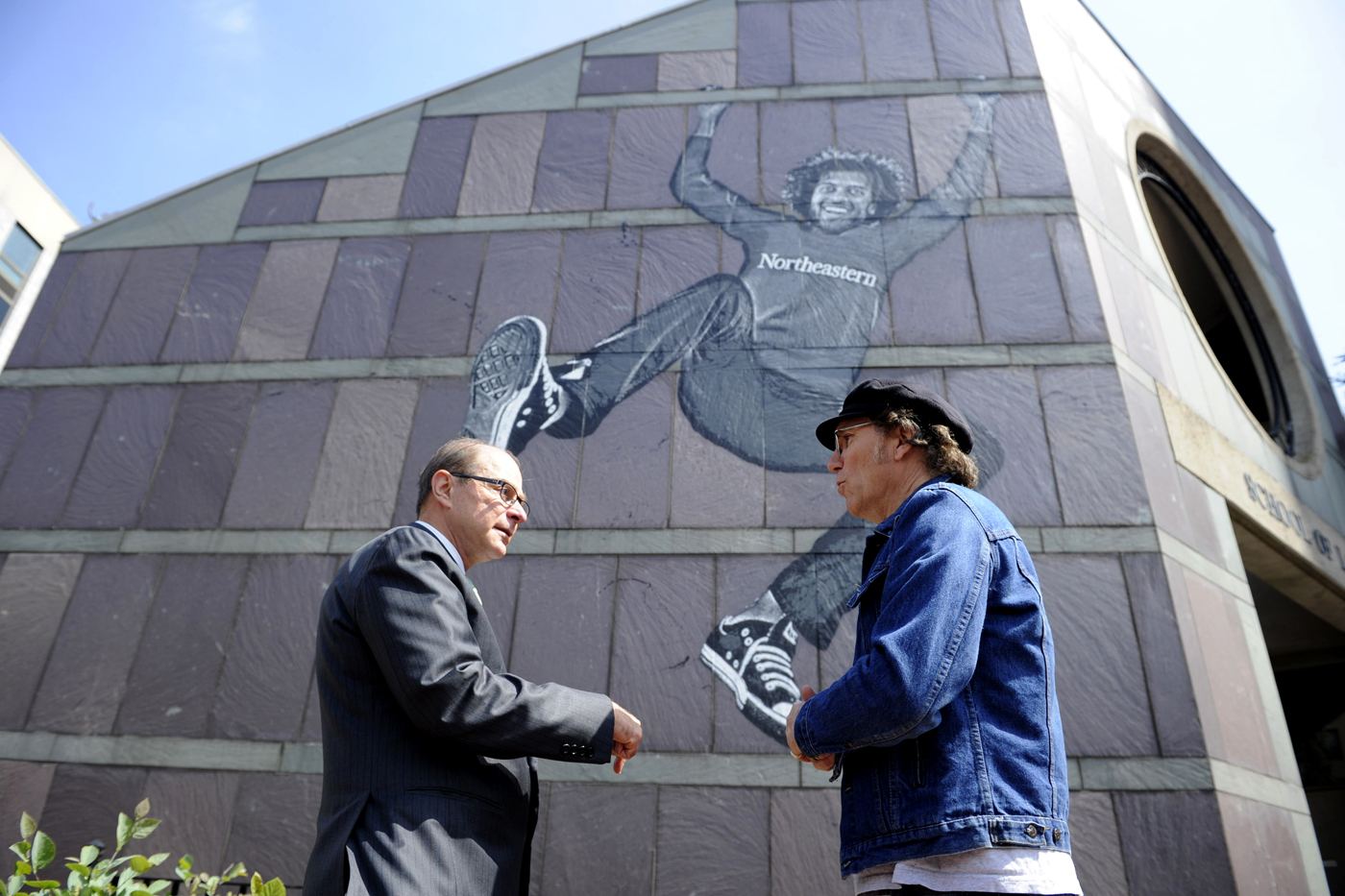 President Joseph E. Aoun meets with internationally renowned stencil artist Jef Aerosol on Monday next to the Huntington Avenue side of Cargill Hall, one of the several campus locations where Aerosol is installing stencil art as part of President Aoun’s Public Art Initiative. Photo by Matthew Modoono/Northeastern University