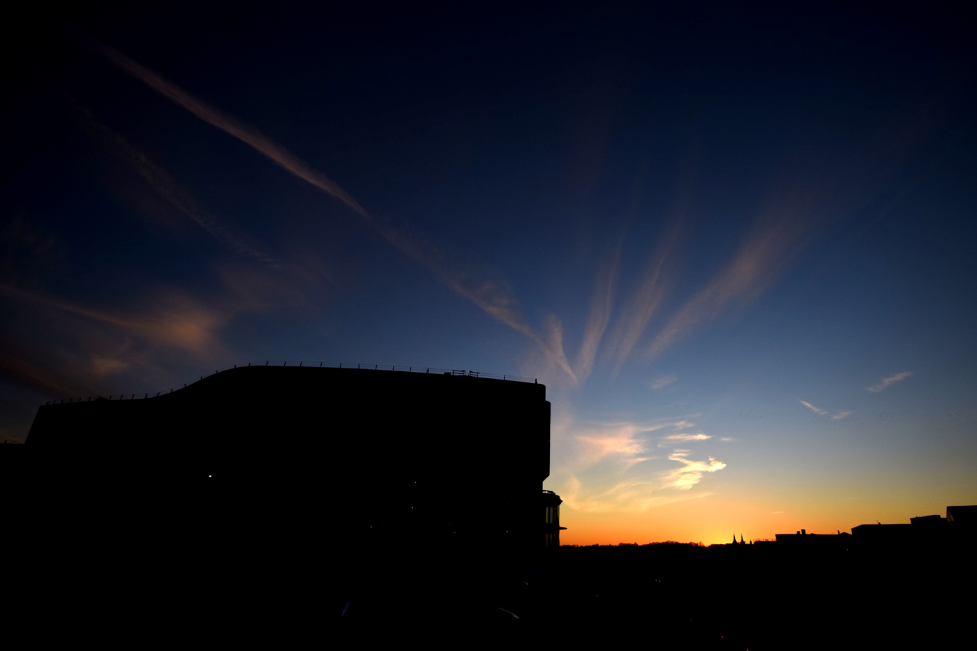 The sun sets behind the Interdisciplinary Science and Engineering Complex on Thursday. Photo by Matthew Modoono/Northeastern University