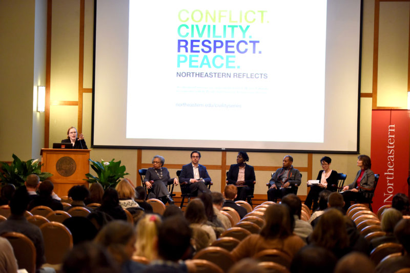 The event marked the ninth installment of “Conflict. Civility. Respect. Peace. Northeastern Reflects,” the university’s educational series on civic sustainability. The theme of the discussion looked to overlap with this week’s celebration of Martin Luther King Jr.’s life and legacy as well as last week’s call to action by Northeastern President Joseph E. Aoun to deepen the university community’s effort to promote diversity on campus and to foster inclusion in Boston and the wider world.