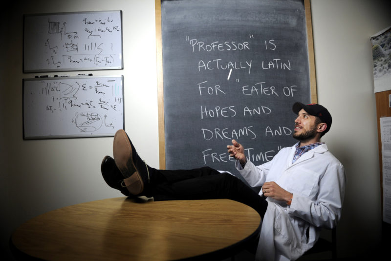 Landherr’s popularity in the webcomic community has led to a range of new opportunities both on and off campus. Within the past few years, he’s attended the Emerald City Comicon, delivered a stand-up comedy routine at AggieCon, and made friends with the cartoonist behind a popular webcomic series called “Girls With Slingshots.” In 2015, he received a grant from the Office of the Provost to create a series of science-based webcomics to help his students understand difficult chemical engineering concepts. One of them, which features Landherr in cartoon form, attempts to explain a concept called fugacity. “Students like them,” says Landherr, noting that professors at more than two dozen other colleges nationwide have asked to use the comics as part of their lessons. “We’ve seen an improvement in their learning as well as an improvement in their confidence.”