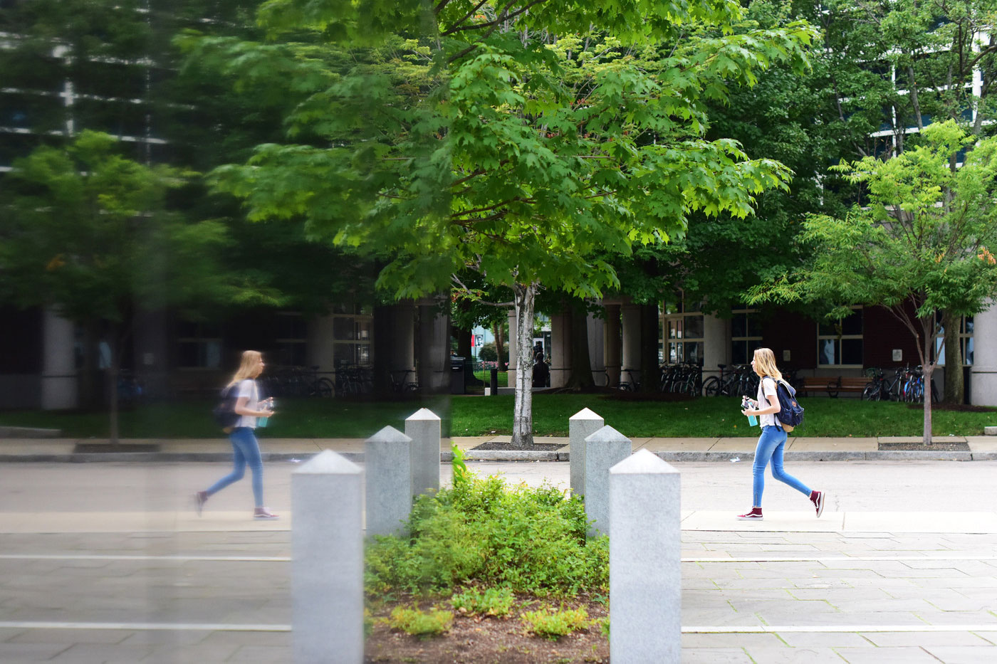 A student is reflected as she walks past the Veterans Memorial on Friday. Photo by Adam Glanzman/Northeastern University