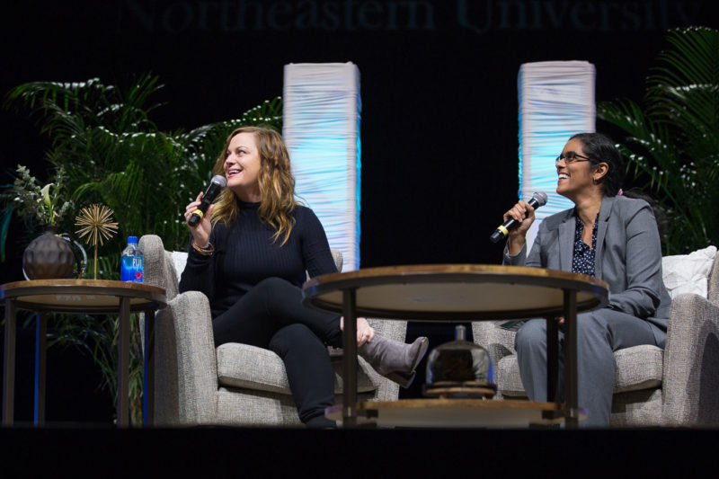 Poehler, best known for her roles on Saturday Night Live and Parks and Recreation, was interviewed on stage by Meghna Chakrabarti, of WBUR’s “Radio Boston.” Poehler, who grew up in Burlington, Massachusetts, said she was happy to be home and offered a fun fact about Matthews Arena, the event’s venue: her parents had their second date there.