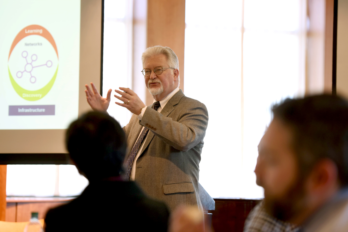 Provost James C. Bean and Thomas Nedell, senior vice president for finance and treasurer, kicked off the meeting with an overview of how the long-range plan is organized into four categories, of which there is overlap: networks, learning, discovery, and infrastructure. They pointed to some key areas of focus within these categories, including more robust analytics that drive decision-making, customized experiential education, and the expansion of research facilities such as the Marine Science Center as well as new investments in the Northeastern’s schools and colleges.