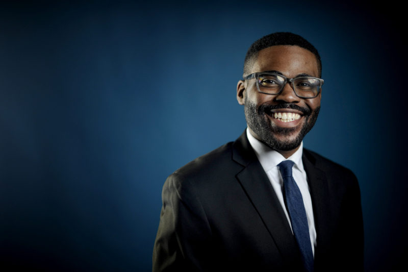 Terrell Hunt, DMSB’13, poses for a portrait at Northeastern University on Friday. He is one of 30 fellows nationwide who were selected to receive a 2017 Rangel Fellowship. Photo by Matthew Modoono/Northeastern University