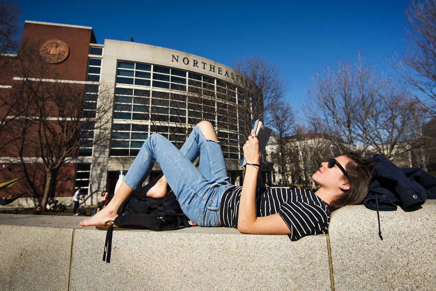 Peyton Luxford, DMSB’20, reads on Centennial Common last week, during a stretch of record-breaking warm weather. Photo by Adam Glanzman/Northeastern University