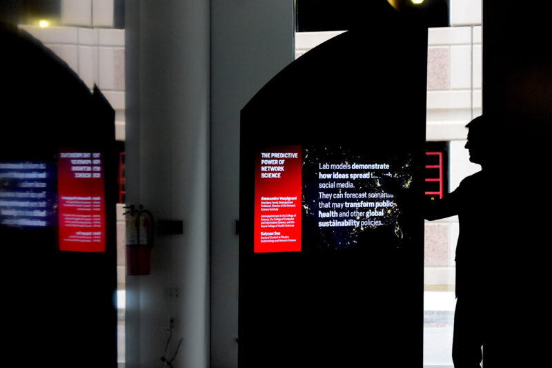 Colorful images of research projects ranging from “Breakthroughs in Airport Security” to “Making Coastal Ecosystes Resilient” fill a large room off the Atrium of the Interdisciplinary Science and Engineering Complex. Attendees at the ISEC opening interact with Northeastern researchers who explain their groundbreaking findings.
