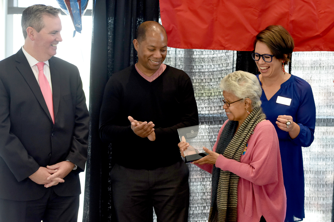 City and Community Affairs staff members were dressed in superhero garb, donning Superman-style capes in honor of the award recipients’ herculean efforts to do good in their communities. Photo by Matthew Modoono/Northeastern University