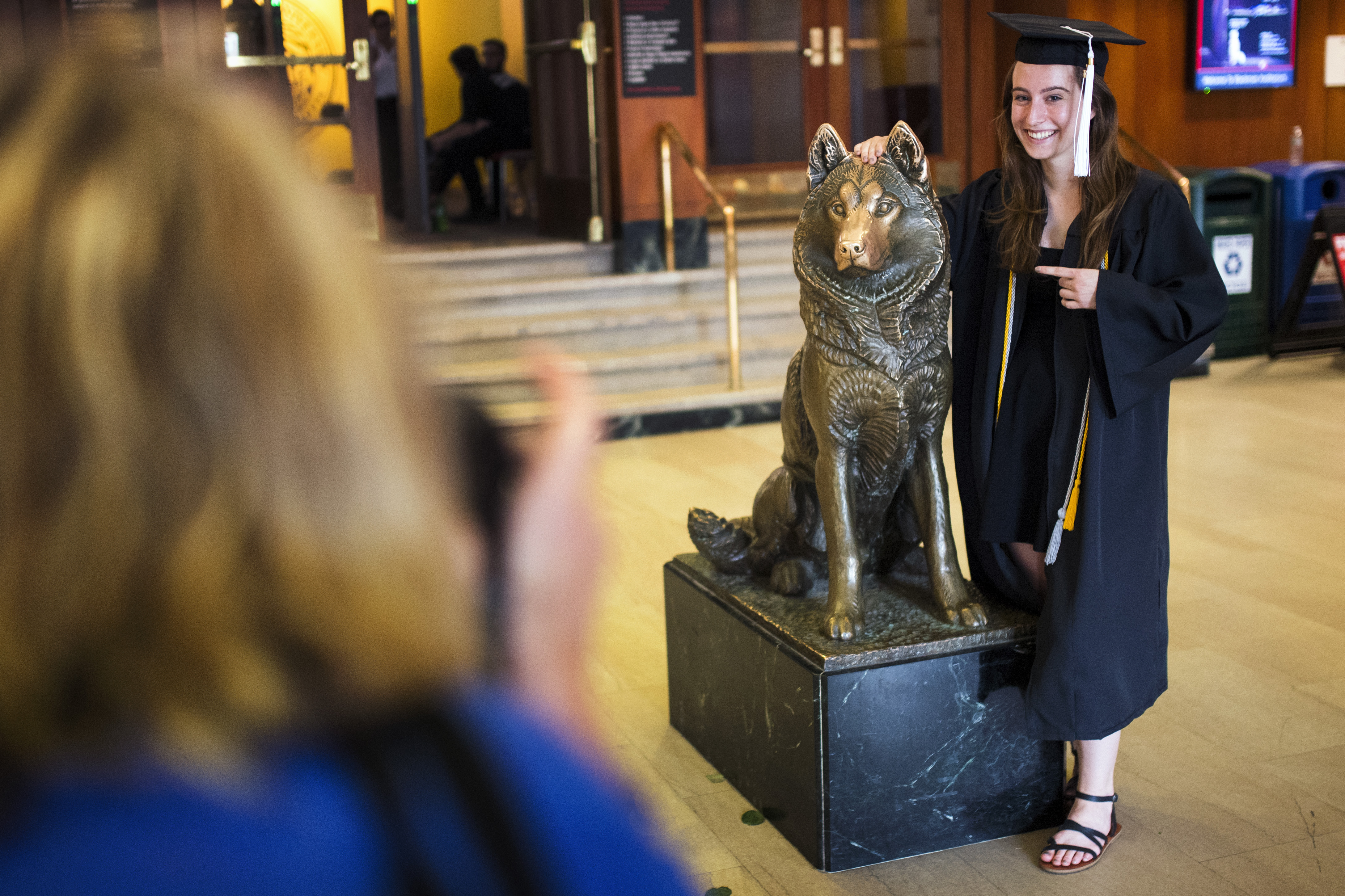 Carly Davis, senior in the college of arts media and design, poses for a photo by the King Husky statue in Ell Hall on May 3, 2018. Photo by Adam Glanzman/Northeastern University