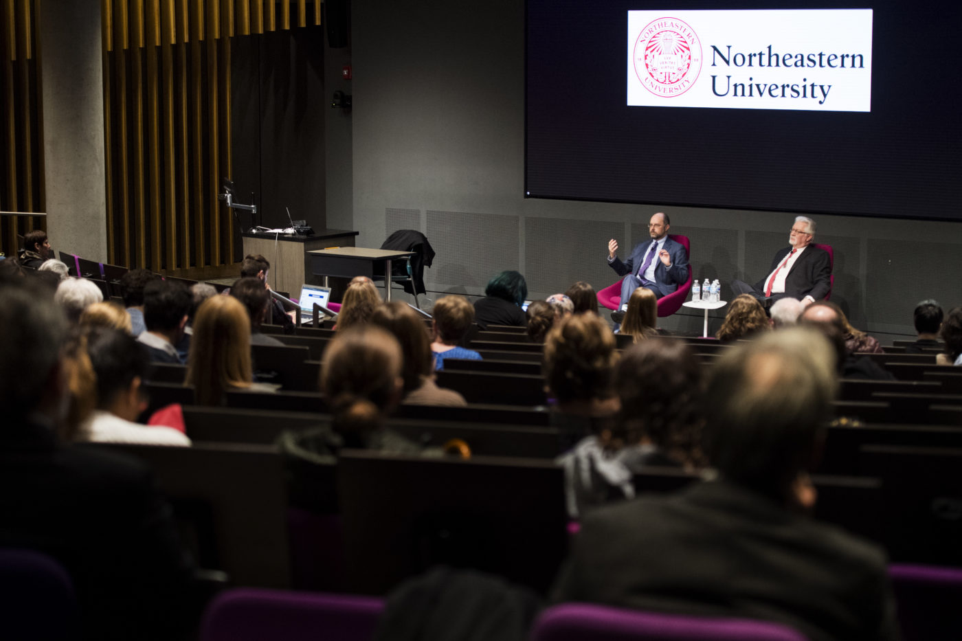 The meeting in the Interdisciplinary Science and Engineering Complex was the second of two such gatherings to discuss Northeastern’s reorganization. Faculty and staff across Northeastern’s global university system—which includes campuses in Boston; Charlotte, North Carolina; the San Francisco Bay Area; Seattle; Toronto; London; and the Massachusetts communities of Burlington and Nahant—joined the conversation via livestream at both meetings.