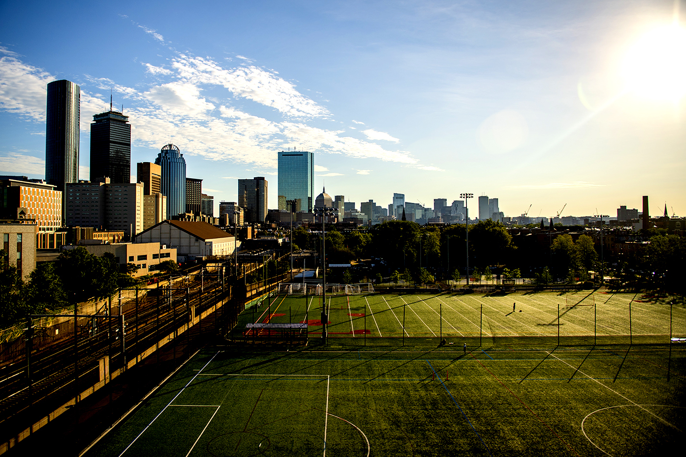 A sunny Boston morning bathes the William E. Carter Playground in a swathes of gold. The transformation of the park was a 2018 collaboration between Northeastern and the city of Boston. Photo by Matthew Modoono/Northeastern University