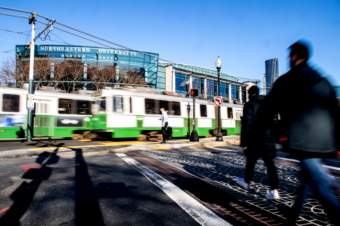 Seeing green by Matthew Modoono January 25, 2021 Share Facebook LinkedIn Twitter Members of the Northeastern community cross Huntington Avenue. Photo Matthew Modoono/Northeastern University Members of the Northeastern community cross Huntington Avenue as two Green Line trains pass each other. Photo Matthew Modoono/Northeastern University