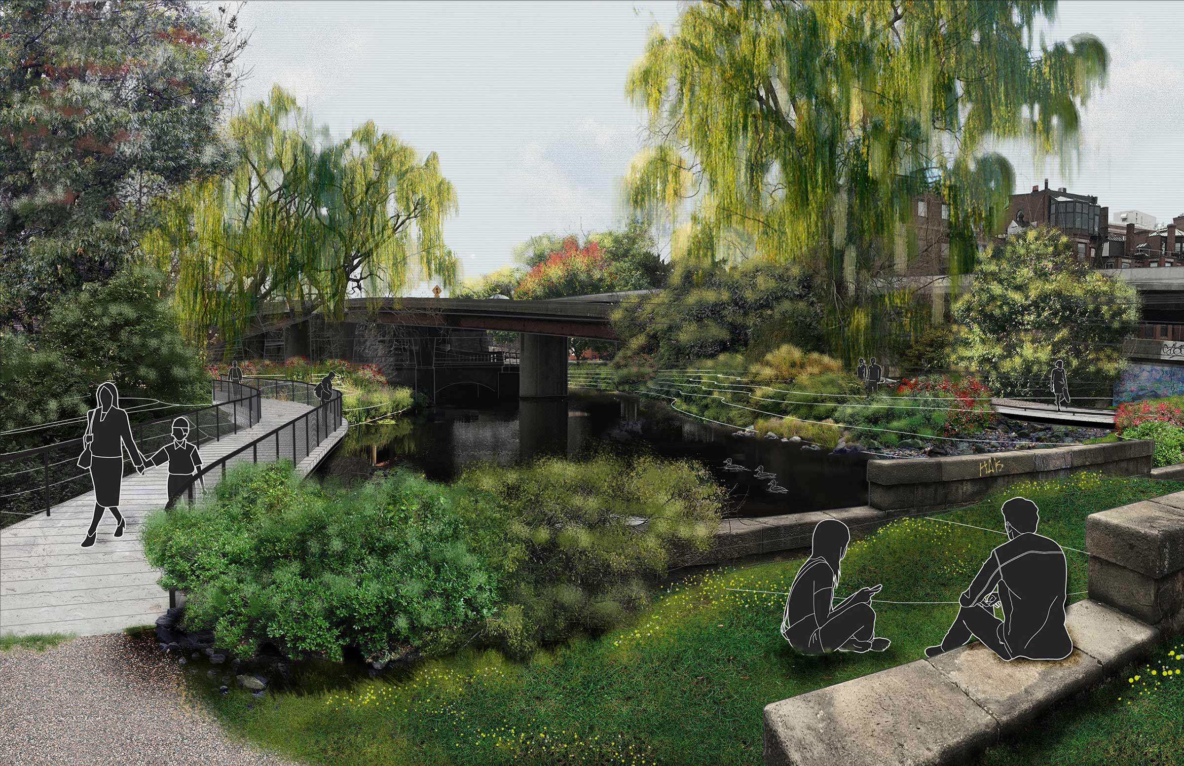 The vision calls for relocating roadways, removing granite walls, planting 500 trees and building double-wide bridges at both ends of the park to create a green corridor that starts by the Esplanade and connects Charlesgate Park to the Back Bay Fens.