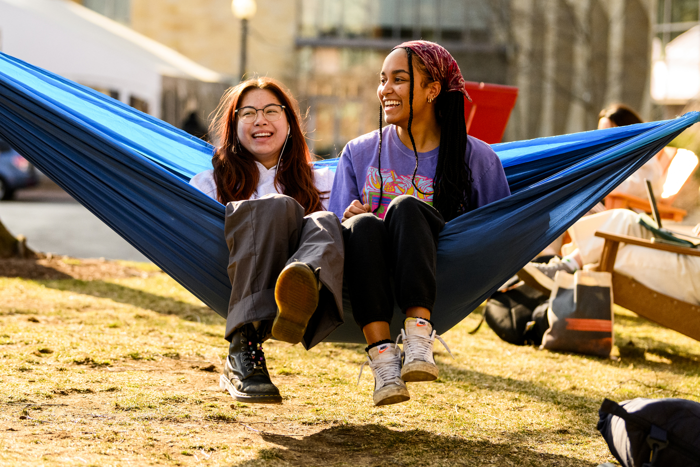 Northeastern students relax in a hammock while enjoying the warm weather at Centennial Common on the Boston campus. Photo by Matthew Modoono/Northeastern University