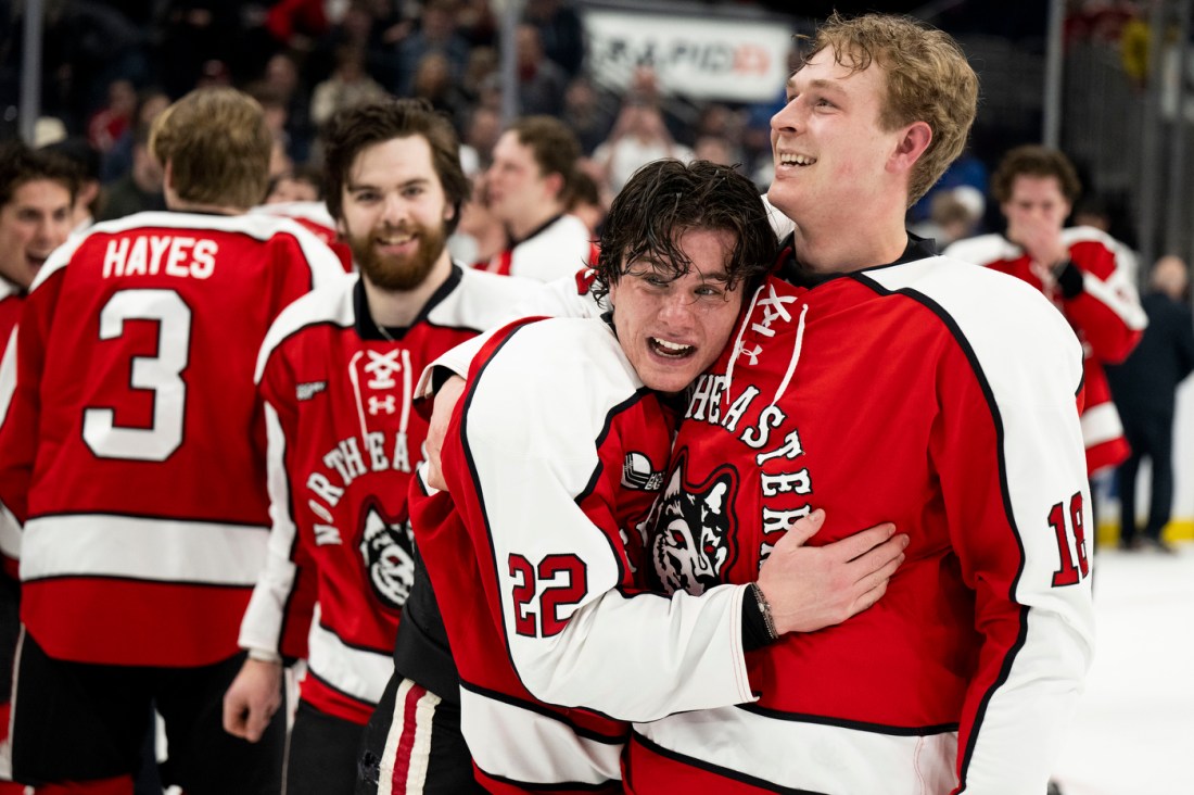 The Huskies’ bench emptied, fans cheered and wept, the pep band played “Stacy’s Mom,” and Northeastern School of Law graduate and Massachusetts Gov. Maura Healey handed over the Beanpot trophy.