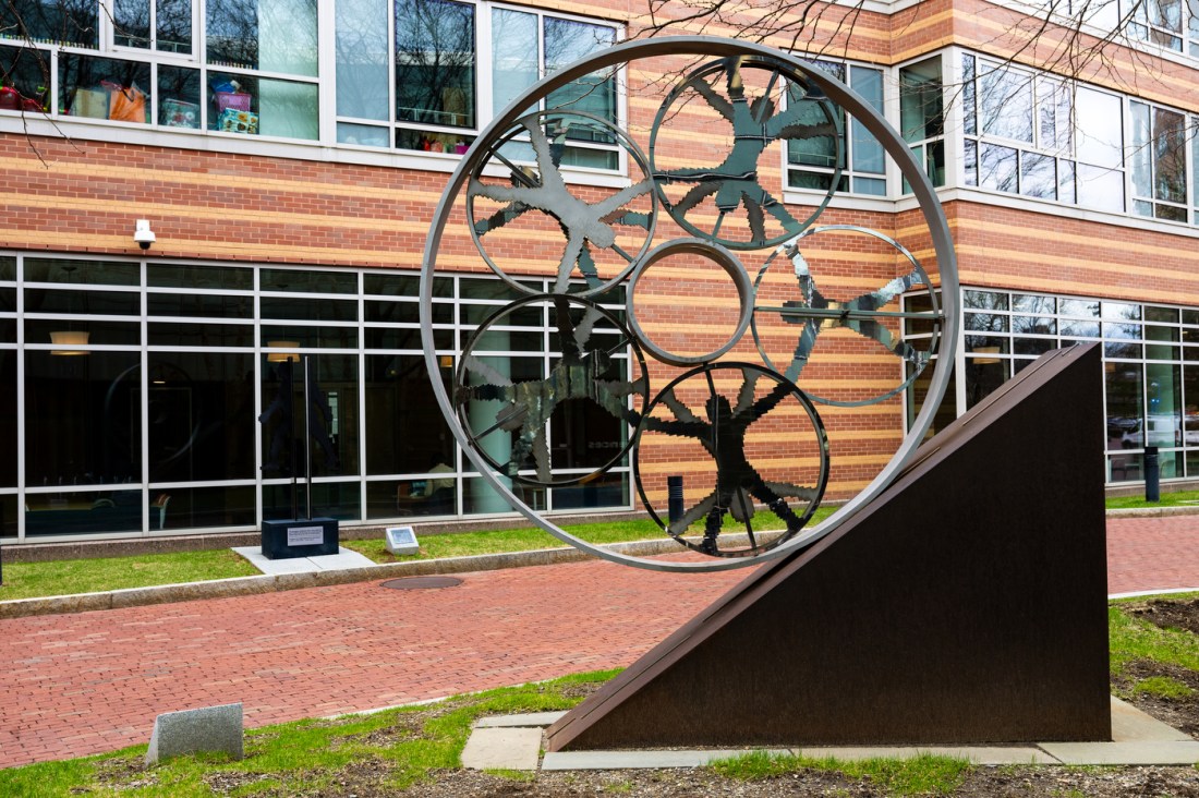 “A Quantum Figure” is a 7-foot stainless steel sculpture situated near “Homage to Galileo” in the West Village area of the Boston campus. The work exemplifies Bakalar’s integration of figurative and geometric forms, reflecting his background in physics. The sculpture invites viewers to explore the relationship between scientific principles and artistic expression.