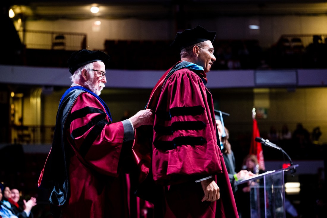 Andrew Michael Holness, the Prime Minister of Jamaica, receives his doctoral degree at the College of Professional Studies commencement. Photo by Matthew Modoono/Northeastern University