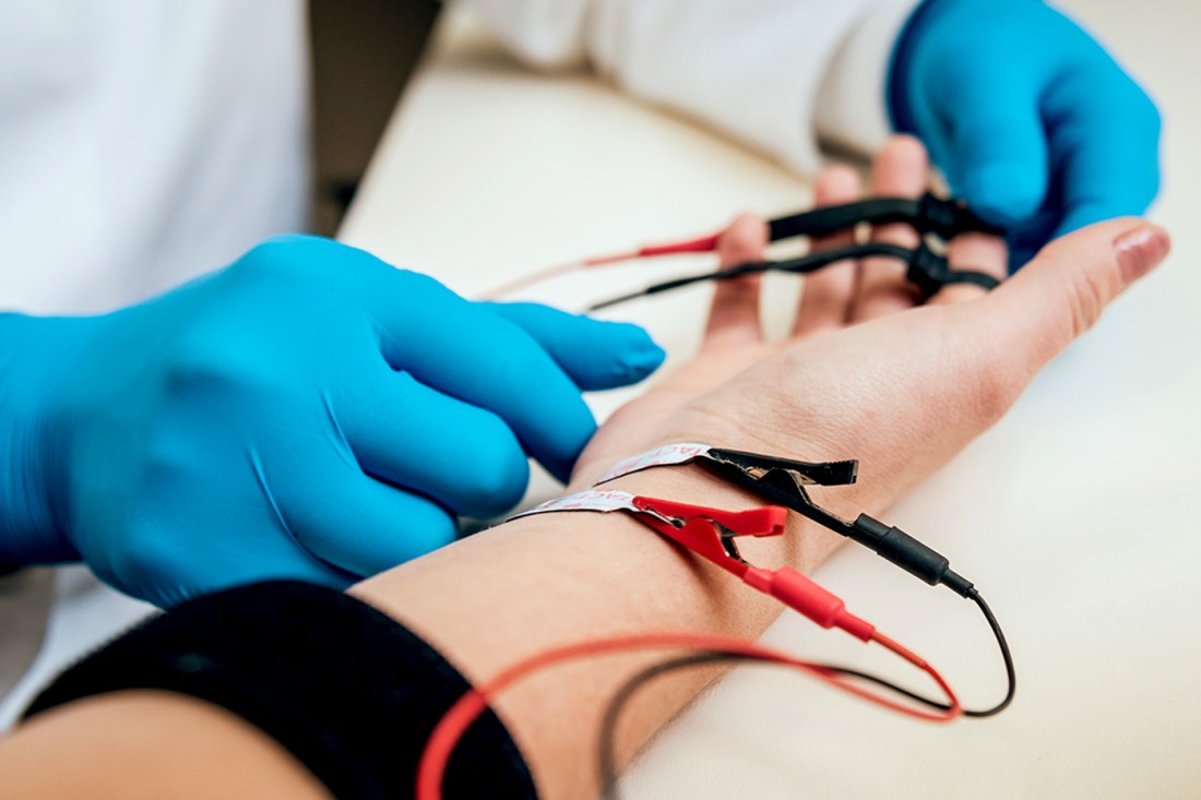 Northeastern University speech therapy student Mary Cho’s eyes grew wide as the electrical shocks hit her arm.