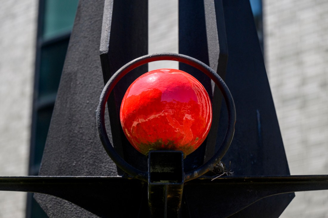 The artwork is black metal with a red ceramic ball in the middle. The piece stands about 16 feet tall, including the black stone base. It is situated on Greenleaf Street, near the intersection with Forsyth Street. The sculpture was a gift from the Class of 1946.