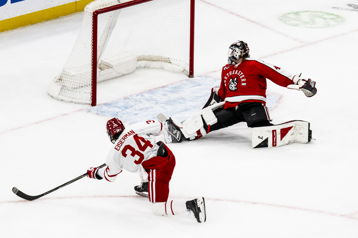 Northeastern goaltender Lawton Zacher kept the score at 1-0 in the first, making 10 saves. And none were bigger than two at the end of the first period. The Terriers had a three-on-two break into the Huskies’ zone. Zacher kicked the first shot wide and B.U.’s Cole Eiserman fired the rebound on net that Zacher kicked away on the biggest save of the first period.