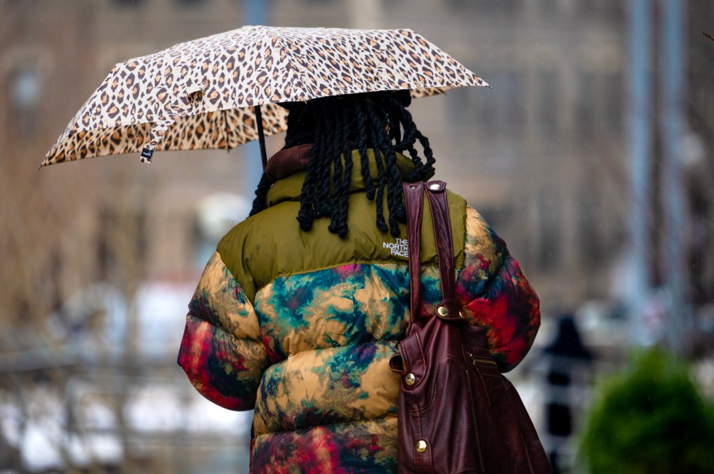 A member of the Northeastern community walks beneath an umbrella through the rainy Boston campus. Photo by Alyssa Stone/Northeastern University