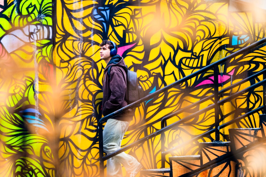 A pedestrian takes the stairs by Daniel Anguilu’s mural “100 Years of Solitude” on the Boston campus. Photo by Alyssa Stone/Northeastern University
