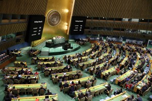 Hundreds of people sit in the United Nations Headquarters, a room with green carpets and wooden benches facing large TV screens.